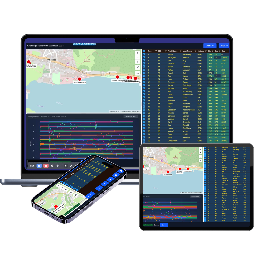 Zeitmessung, Tracking, Live-Ranglisten, Simulation und Analyse in einer durchgängigen Darstellung. Ein Wechsel der Software ist nicht notwendig und alles synchron